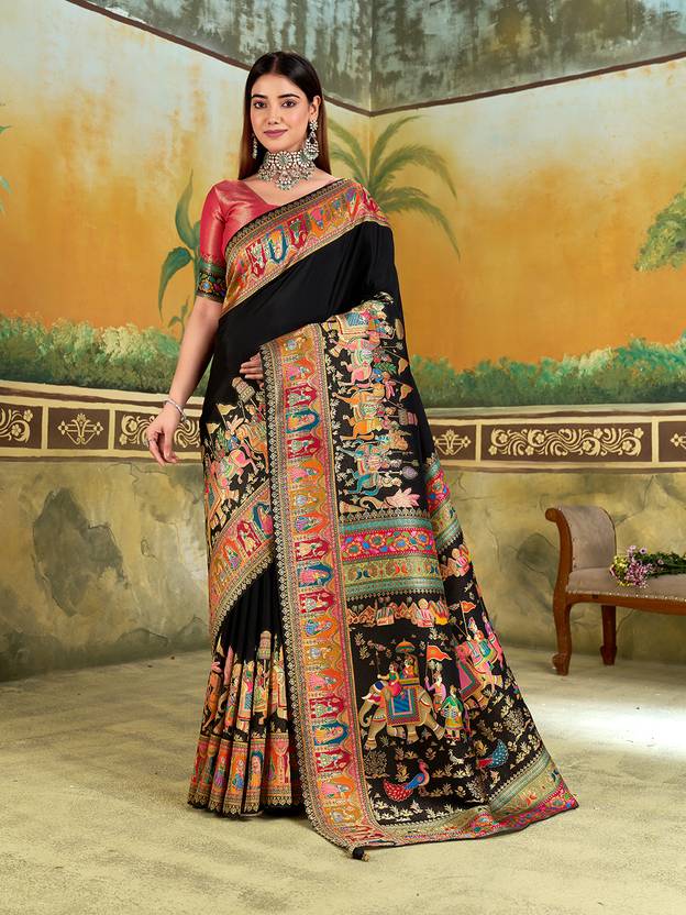 Explore The Collection Of Beautifully Designed Saree. Saree: Black || Saree Work: Postion Print with Zari work || Saree Fabric: Viscose Silk | Blouse Fabric: Viscose Silk|| These Saree Are Perfect For Occasions And Events Anytime Of The Day Or Night.