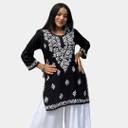 Black Short Chikankari Kurta Handcrafted with intricate white embroidery, this black kurta exudes elegance. It features a short length and a relaxed fit, making it perfect for both casual and festive occasions. Pair it with white palazzos or a flared skirt for a stylish ethnic look or with damaged jeans