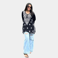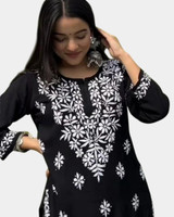 HouseOfTheSukh Women Chikan Embroidery, Embroidered, Solid, Self Design Straight Kurta (Black, White)