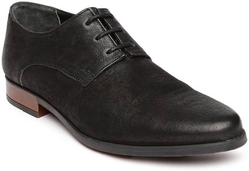 A pair of black Derby shoes with central lace-ups. Leather upper. Slightly cushioned footbed. Textured outsole with a stacked heel. Comes in a bag. Warranty: 3 months against manufacturing defects. . Just like the star himself, this pair of Derby shoes from HRX by Hrithik Roshan is high on performance and style. With amplified sheer class and extreme comfort, it remains an undisputed super-trendy pick of the season. Team it with denims and a T-shirt for a refined look.