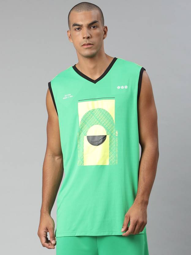 With classic details and modern technology, the HRX Mens Basketball T-shirt offers the perfect balance of functionality and comfort. The Rapid Dry technology fights sweat to keep you comfortable while the Anti Static technology gives you the perfect fit without clinging to your frame.FeaturesBasketball T-shirtRapid Dry Technology wicks sweat amp; makes the fabric dry fast.Anti static technology to keep the garment from clinging to you.Neck: V NeckSleeve length: SleevelessDesign: Graphic printColour: Kelly GreenFit: Basketball Fit. This Tshirt from HRX by Hrithik Roshan is a definite pick for your wardrobe. Wear it with a shorts and a pair of shoes for a complete ensemble.