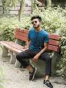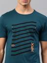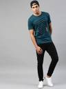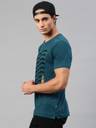 Teal blue and black striped waist length T-shirt, has a round neck, short sleeves. Sport this trendsetting HRX by Hrithik Roshan tee when you're ready to take your style to the next level. When you're going for a stroll in the park, put this teal piece with a pair of chinos and sneakers to feel both comfortable and stylish outside.
