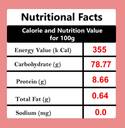 • Calories 355 from 100gm, Cholesterol 0mg, Sodium 0mg, Carbohydrates 78.77g, Protein 8.66g
