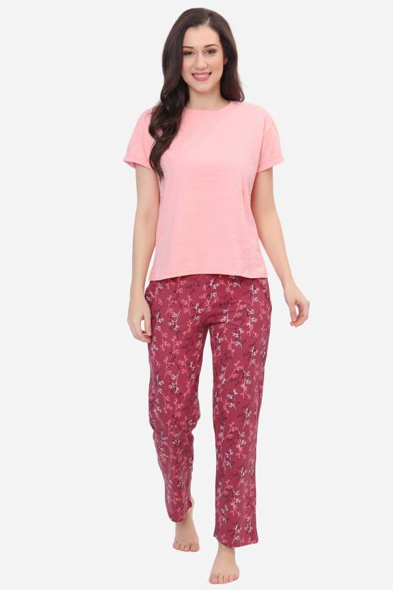 HUIS & LOISIR Women Top & Pyjama Set Pink, Maroon Printed