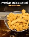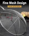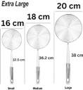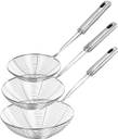 1. 3 sizes Stainless Steel Spider Strainer Skimmers Large Size: 6.1"(diameter), 2.2"(depth), total length is 14.96". Medium Size: 5.3"(diameter), 1.85"(depth), total length is 14.25". Small Size: 4.53"(diameter), 1.38"(depth), total length is 12.8".. . . . .. . .. .. . . . . . . . . . . 2. Material: High quality no rusting Stainless Steel. Advantages: 1. Stainless Steel, no rusting worries. 2. 3 sizes for any pots. 3. Scientific design, the hole on the handle, they could be hanged on the wall when you don't need them. 4. Anti-slip handle design: you could hold them tightly even if there is oil on your hand. 5. Suitable Occasion: Frying food, making noodles, making dumplings, boiled vegetables and so on.