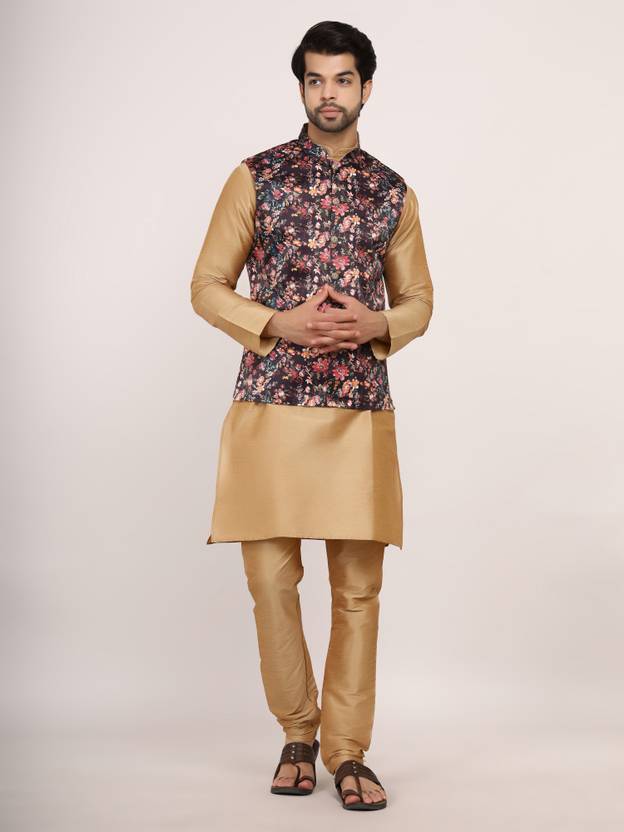 A kurta pajama paired with a Nehru jacket is a classic and stylish ensemble that blends traditional Indian attire with a touch of modern elegance. The kurta is a long, loose-fitting tunic that typically reaches below the knees. It is made from Dupuion SIlk Kurta Pajama and Satin Fabric used in Nehru Jackat. The pajama, also known as pyjama or churidar, is the bottom part of the attire. It is usually straight-cut and loose-fitting, providing comfort and ease of movement. Named after Jawaharlal Nehru, India's first Prime Minister, the Nehru jacket is a sleeveless, hip-length jacket. It is typically tailored with a mandarin collar that stands up straight, distinguishing it from Western-style jackets.Together, the kurta pajama with a Nehru jacket creates a polished and sophisticated appearance suitable for formal occasions such as weddings, festivals, or cultural events.