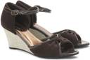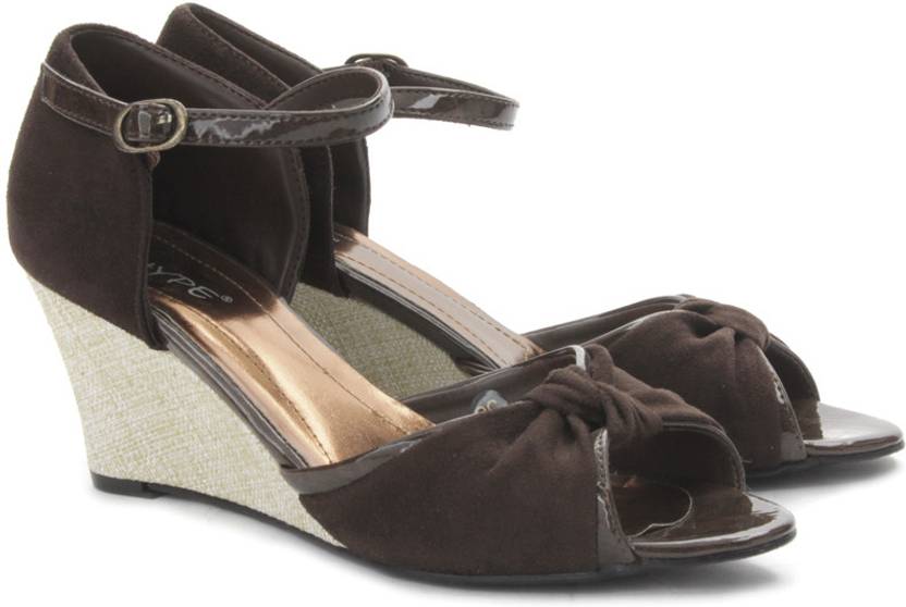 Show-off your beautiful manicured feet wearing these gorgeous peep-toe Wedges from Hype with a pair of beige skirt and a light pink top. Crafted with a 2.7 inch heel and an ankle strap that bears a buckle closure, these brown suede wedges are styled with a broad strap and a knot.