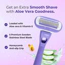 Aloe vera and vitamin E present in the razor are ideal for people with dry skin. They help in soothing and hydrating your skin, giving you the desired result. This razor is designed to provide a moisturising effect during shaving, thus reducing dryness and preventing irritation. Aloe vera and vitamin E act as a protective barrier and help to reduce friction between the razor blades and the skin. This barrier can eliminate nicks, cuts, and razor burns, making the shaving process easy. Aloe vera and vitamin E also have anti-inflammatory properties to calm and reduce redness or irritation.