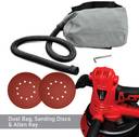 | Key Features | - [MULTI-PURPOSE] The sander is suitable for sanding plastered walls, ceilings, and interior walls, as well as for removing paper residues, paint layers, coatings, adhesive residues, and loose plaster., [PROMINENT DESIGN] The tool has a large surface area, a wide base. This makes tackling those big walls easier as you are able to attack a larger section of the wall at once, [DUST EXTRACTION] This drywall sander has an in-built dust extraction accessory, designed to collect all those fine plasterboard dust particles away from the motor, [LED LIGHT SWITCH] There is an LED attachment on this product which shines light on pits and imperfections on the wall, making it easy to re-sand those problematic areas the minute you saw., [DETACHABLE EDGE] This has an adjustable edge guard (a portion can be detached from the guard), making it suitable for corners and all., [SPECIFICATION] With a rated power of 1300W, the 3.25kg sander can provide an idle speed upto 2600rpm with a suction rate of 97%.