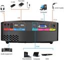 Adopt LCD Technology with More Than 30000 hours of LED lifespan, features 1800 Lumens brightness, 2200:1 contrast ratio design and 800 * 480 (WVGA) resolution, supporting up to 1920 * 1080 (for a 1080P video-allowing you to watch your favorite movies in high definition). [High-performance] Brightness: 1800 Lumens, Contrast Ratio: 2200:1. High quality multi-chip-coated optical glass lens provides better color reproduction, better transmittance and better temperature resistance. keeping projection image in focus and color fidelity, much better than plastic lens. [Super Companion for Entertainment] Native Resolution: 800 * 480RGB; Supported resolution:1920*1080, Aspect Ratio: 16:9/4:3. HiFi level stereo audio performance, comes with Built-in amplifier-chip and built-in stereo speakers(4?,5W) with SRS Sound, SRS is the best sound technology at the present time, providing cool home theater experience. Support multimedia formats (Videos, Music, Picture, TXT), ideal for movies and video game use. Also support rotating the image when plays the multimedia files. [Adjustable Projection Distance & Projection Size] Offer 28 ~ 180inches image size and 1.2m ~ 5.5m Projection Distance. Giving you a clear frame and a projection size of up to 180 inches, you also can select the optimal size of image by adjusting the distance to obtain the best Use Experience. [Super Sound Effect] Equipped with built-in Speaker(4W 5?), enjoy audio from your videos or use the included 3.5mm headphone jack to connect external speakers or earphones of your choice. Package includes: Mini Projector / Power Adapter / 3.5mm to RCA AV Cable / Remote Controller / English User Manual .