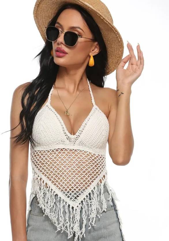 Icw Crochet Bralette Top Women Bralette Lightly Padded Bra (White)