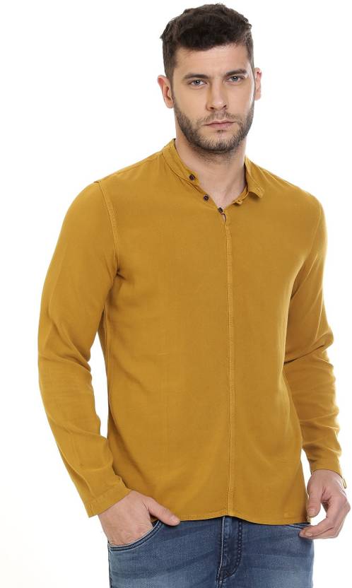 Men Solid Mandarin Collar Viscose Rayon Yellow T-Shirt