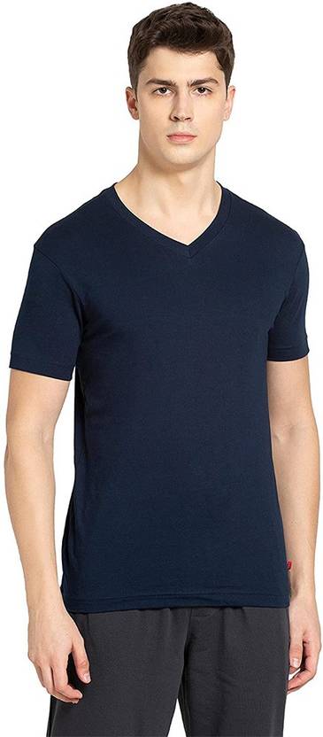 Men Solid V Neck Cotton Blend Navy Blue T-Shirt