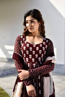 Featuring a beautifully printed pattern, this women’s gown and dupatta set captures a blend of traditional elegance and modern aesthetics. The intricate print flows seamlessly across the gown, lending it a timeless charm that elevates your look for any occasion. So, if you’re attending a daytime event or an evening gathering, the carefully crafted pattern ensures you stand out with grace.