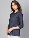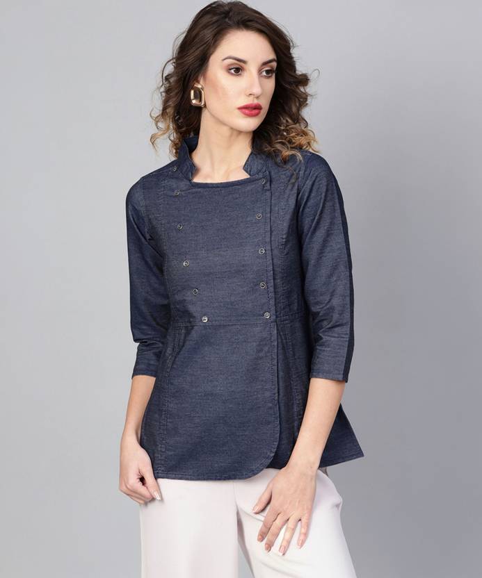 An amazing range of Women Western Wear in soft and solid colors that looks perfect for regular wear. With beautiful designs and patterns. These apparels are very stylish and comfortable too. Get rid of the 'regular' look this season wearing Top by IKRASS. With a perfect blend of comfort and traditional style, This Blue Denim Regular Top from IKRASS exhibits Eyelete Buttons Detailing, Overlape front Slit Along with Mandrin Collar and 3/4th Sleeves. Tailored from Cotton Slub. Length: 26 Inches. This outfit is perfect for women looking for a stylish, comfortable, and versatile kurta set. Designed with premium fabric, it is suitable for casual wear, daily office wear, festive occasions, parties, and weddings. Pair it with leggings, palazzos, or dupattas for a complete ethnic or Indo-western look. Explore IKRASS’s latest kurta sets crafted for elegance and everyday comfort.