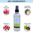 Aqua (water), Bulgarian rose hydrosol, Camellia sinensis, Rubus odoratus (raspberry), Vitus vinifera (grape seed) *and nothing else.