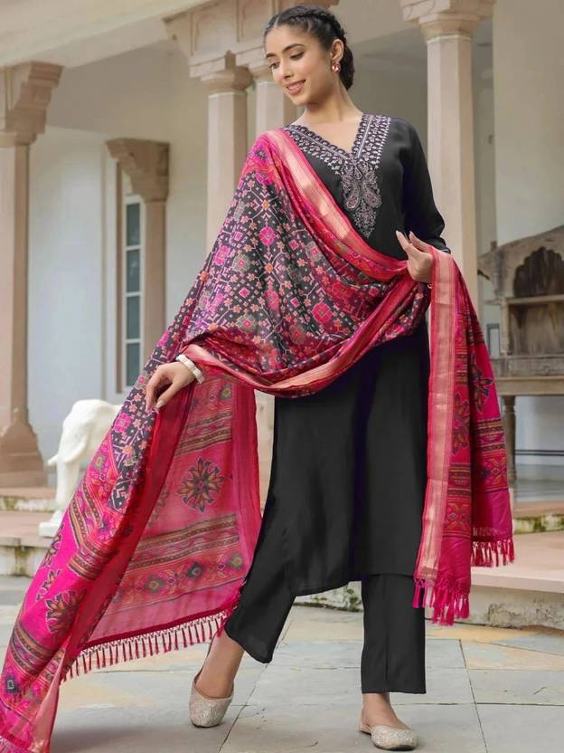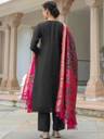 Our 3-piece Black silk blend suit set features an embroidered straight-fit kurta with a keyhole neckline, three-quarter sleeves, and a statement yoke. Complemented with trousers with a partially elasticated waistband and roomy pockets, and a dupatta. Adorned with intricate embroidery, sequins accents, and handcrafted fabric button, this style is perfect for casual outings.