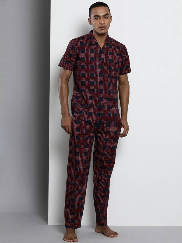 The Indian Garage Co. Men Checkered Blue, Red Night Suit Set