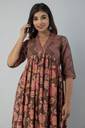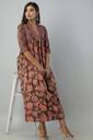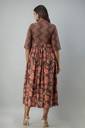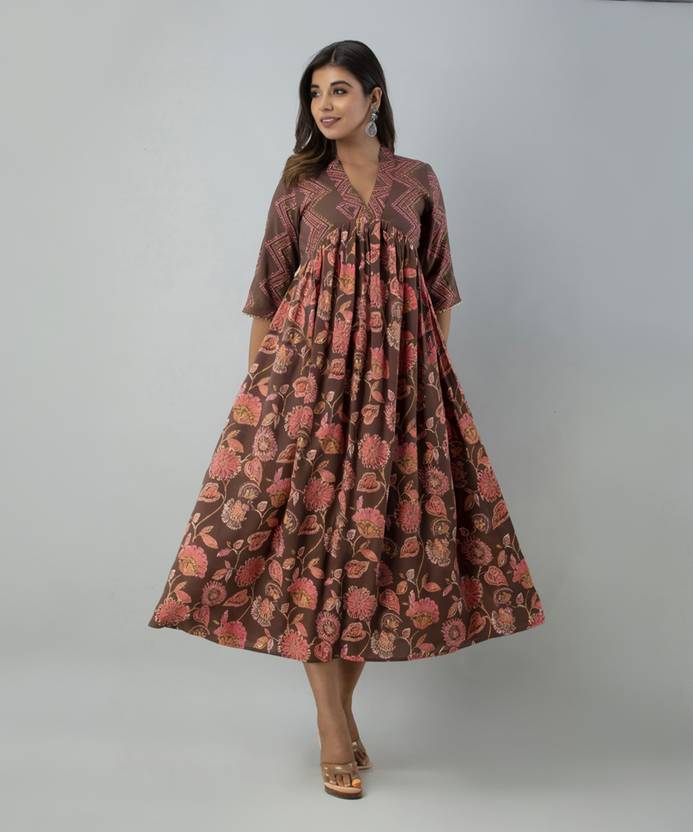 Women Floral Print Viscose Rayon Flared Western Wear Dress (Brown)