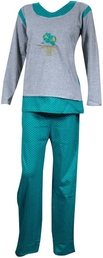 Indiatrendzs Women Top & Pyjama Set Green, Grey Polka Print, Solid