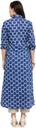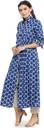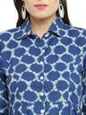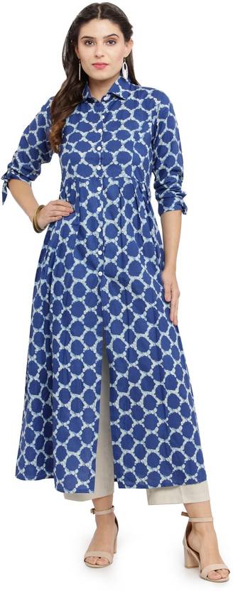 Indibelle blue shirt style cotton printed kurta, 3/4 knot sleeve, shirt collar, front slit, full placket opening with detailing functional 10 button, use the box pleats on the front side, flared hem.