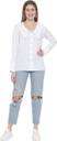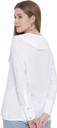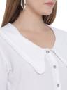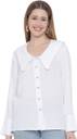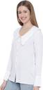 Plus Size White Solid Cotton Linen Casual Shirt Tops has a gathered peter pan collar, button placket, long sleeves with buttoned cuff & curved hem.