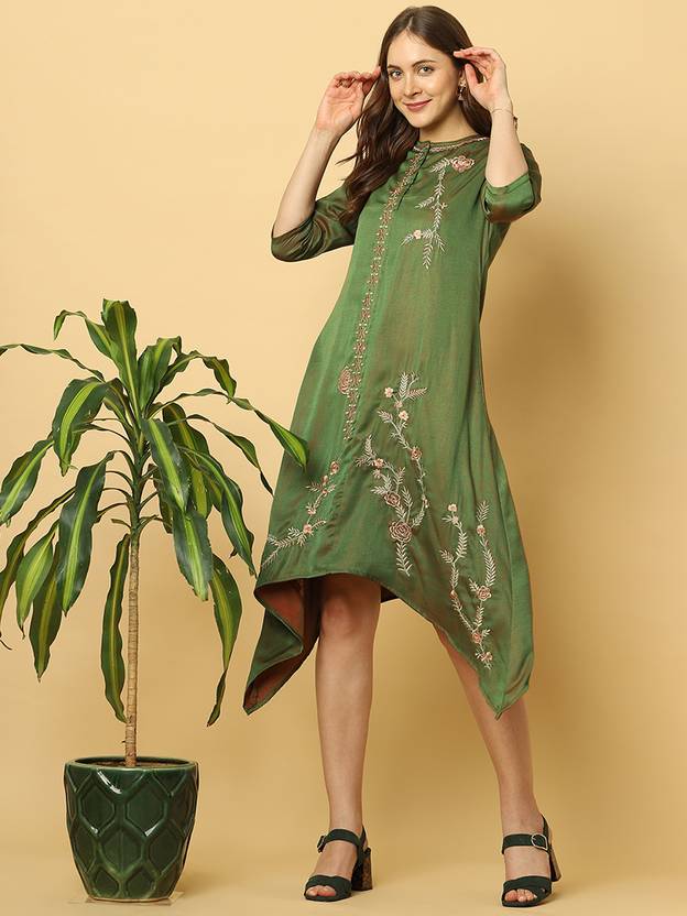 Kurta/Dress With Round Neck, Front Placket, 3/4 Sleeves, Asymmetric Hem & Embroidery