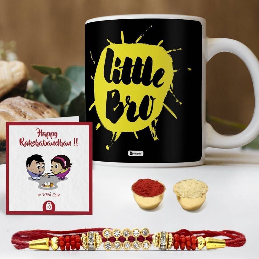 1 Rakhi, 1 Coffee Mug, 1 Roli Chawal Packet, 1 Greeting Card