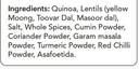 | Ingredients | - Quinoa, Lentils(dal),Whole spices, cumin powder, coriander powder, salt, red chilli powder, turmeric powder, ginger powder, garlic powder, asafeidita