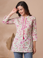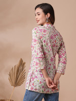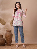 Offering a chic and modern look, this kurta features a short length and ends above your hips. The shorter length adds a trendy and youthful touch to your outfit and makes it a fashionable choice for various occasions. This style is also ideal for casual wear and provides comfort and ease of movement. It's versatile and pairs well with jeans, trousers or skirts.