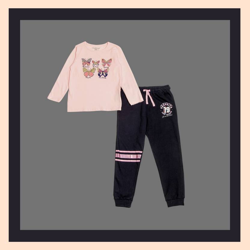 Set of Pink top & Black Pants for girls aged between 2 to 8 years. A Showstopper dress with cute little Butterflies printed on the Top. The pink colour of the Top matches perfectly with the stripes & drawstrings on the Black Pants. Made with soft & light weight cotton fabric for a tender touch little girls need. A Charming & Elegant Dress set for all seasons.