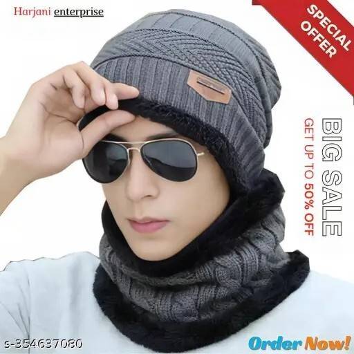 Winter Woolen Unisex Fur Fleece Lined Stylish Beanie Knitted Cap with Neck Warmer for Men and Women