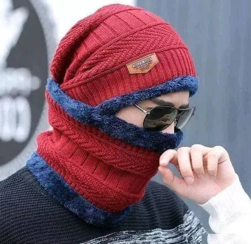 Winter Woolen Unisex Fur Fleece Lined Stylish Beanie Knitted Cap with Neck Warmer for Men and Women