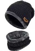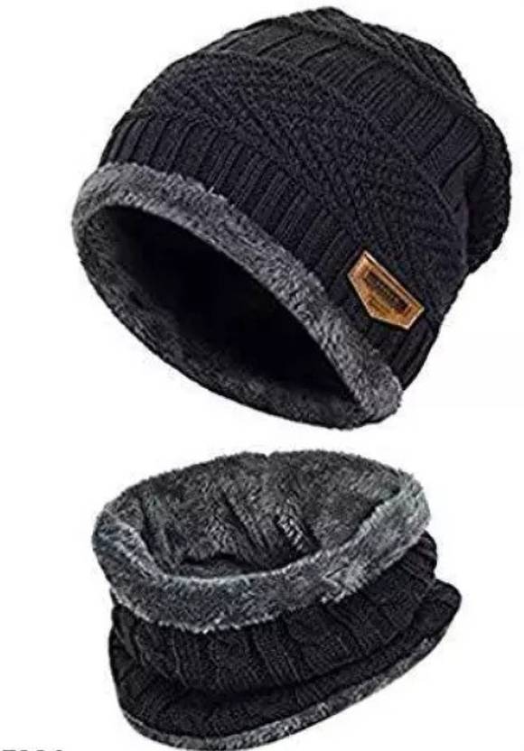 Winter Woolen Unisex Fur Fleece Lined Stylish Beanie Knitted Cap with Neck Warmer for Men and Women