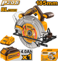 INGCO Cordless Brushless Circular Saw with a 185mm Saw Blade 4.0Ah Battery and Charger Handheld Tile Cutter (0 W)