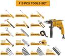 | Key Features | - [ 115 Pcs Tools Set ]---Include: Impact Drill, Claw Hammer, Combination Pliers, Adjustable Wrench , Screwdriver Steel measuring tape, Drill bits, Magnetic bits holder, Test pencil , Pvc Insulation tape, Plastic plugs, [ 680W Impact Drill ]---INGCO impact drill with extra large kit for multiple needs and includes 114 accessories. 13 mm Chuck Size, Hammer Drill or Drill Driver Selecter with Variable Speed/Reverse Switch for control & precision, [ Be Your Own Mechanic ]---One stop solution for all your mechanic needs. The all-in-one drill kit is ideal for wood, metal & concrete drilling, [ Electric Hammer Drill Variable Speed ]---The impact drill wired speed is adjustable. The setting knob allows you to control the drilling speed between 0-3000RPM to adapt to different jobs, power drill corded Lock button reduces fatigue during long hours of work.