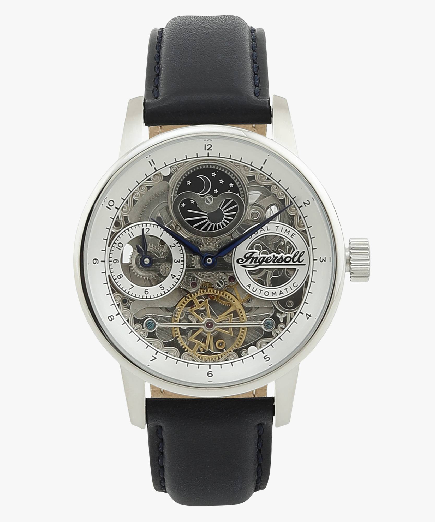 Classic Ingersoll Mens watch I07702. Colors > Dial: Silver, Bracelet: Blue, Case: Silver. Very comfortable Calf leather strap. The water resistance is 5 ATM. A scratch proove hardened, Mineral glass protects you watch from involuntary injuries.