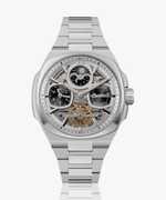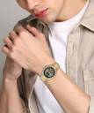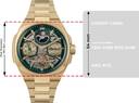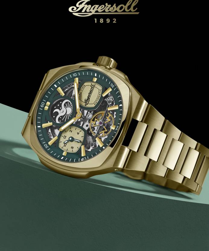 The Ingersoll Mens watch I15803 is an elegant companion from the model series The Spirit Automatic 47mm 5ATM. A perfect choice if you are looking for a timepiece with a classic look.The watch has a golden case, made of Stainless steel, which looks like a real eye-catcher thanks to the Polished, Matted surface.The Cushion case is 47 mm wide , depending on individual taste, will adorn almost any wrist. The bezel, which is Fixed, stands out discreetly from the case. The case back of the watch is a Glas bottom, screwed, which sets the final point for a coherent design.The Mineral glass, hardened offers extensive protection against accidental scratches and damage. Underneath, the dial of your new dream watch is Golden.At the heart of this timepiece is an automatic movement that, as is usual for Ingersoll watches, guarantees precise timekeeping and provides the following functions: Hour, Minute, 2 timezones, Day & night.
