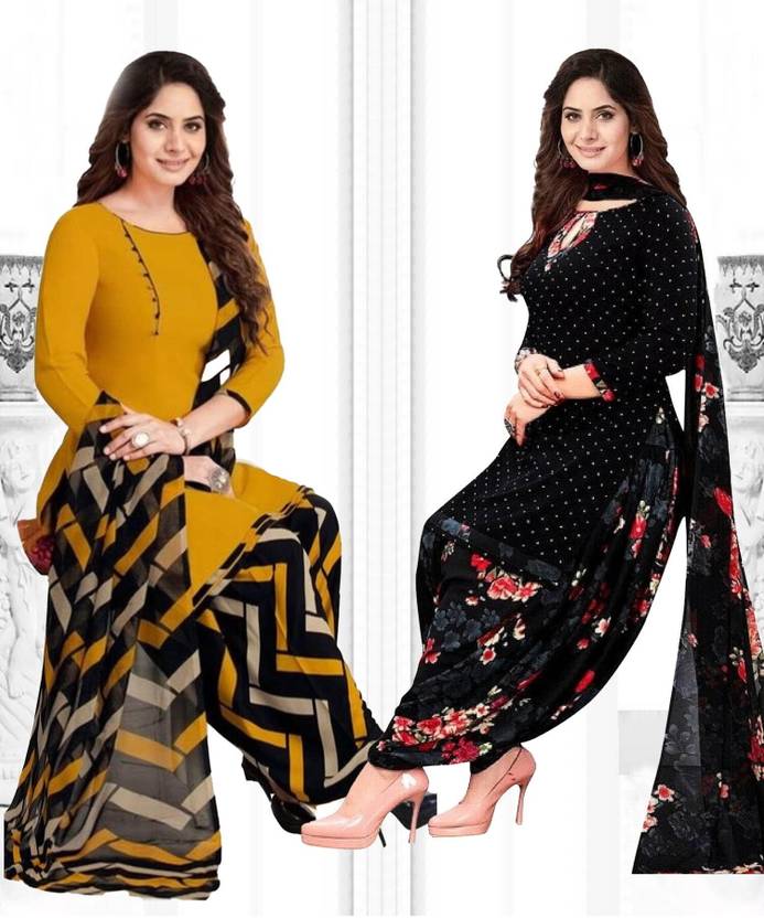 Crepe Printed Unstiched Dress Material. Add style to your Daily Wear Collection with this Printed Dress material Salwar suit. Two Unstitched Salwar, Two Unstitched Top, Two Dupatta.Top & Bottom Fabric : American Crepe, Dupatta Fabric : Martina You can use it for daily wear purpose it will give you immense comfort and fresh styling look.