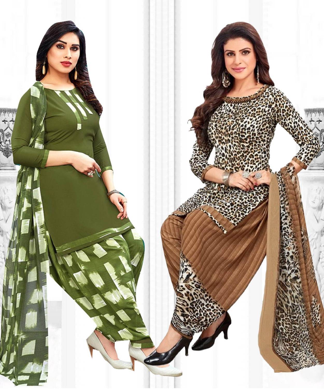 Womens Crepe Printed Unstiched Dress Material. Add style to your Daily Wear Collection with this Printed Dress material Salwar suit. 2 Unstitched Salwar, 2 Unstitched Top, 2 Dupatta.Top & Bottom Fabric : American Crepe, Dupatta Fabric : Martina You can use it for daily wear purpose it will give you immense comfort and fresh styling look.