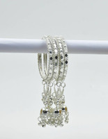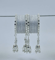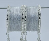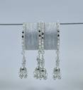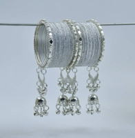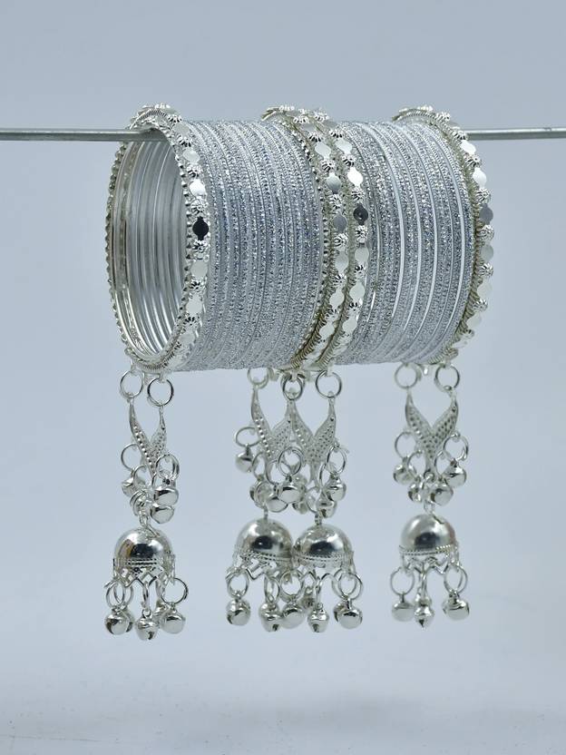 Thanks to its intricate design, these bangles highlight detailed metal work with cascading charms and small bells that produce gentle musical sounds with movement. The traditional patterns are enriched with textured grooves and subtle sparkle accents, making each bangle a true expression of craftsmanship. The finely detailed embellishments ensure that each piece is unique, offering a blend of charm and elegance that enhances its visual appeal.