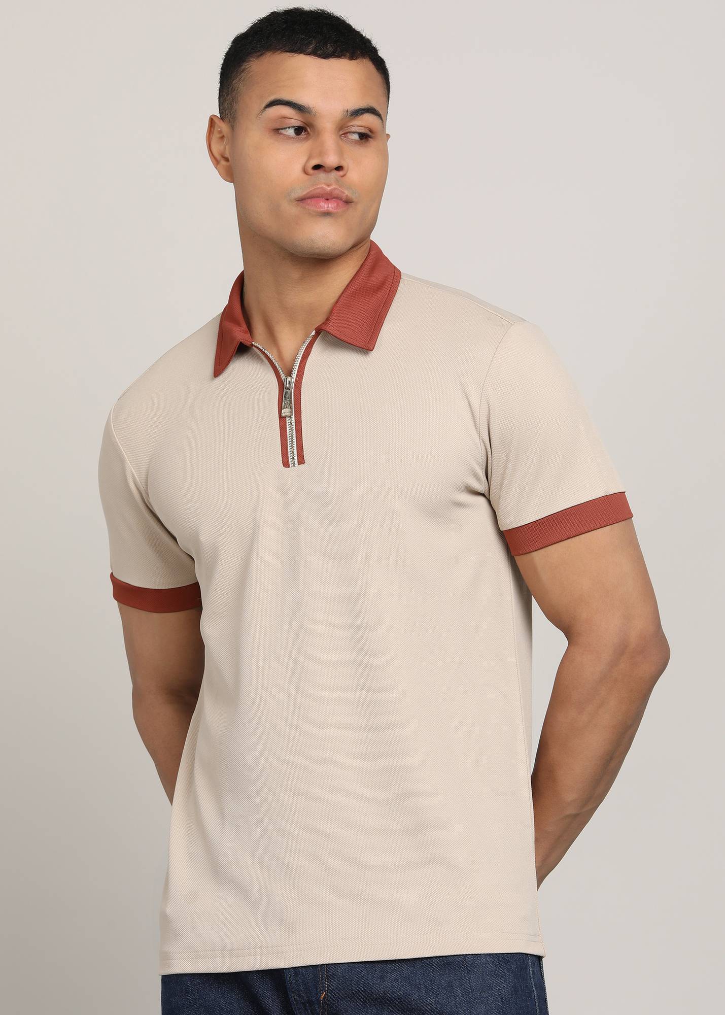 INKKR Solid Men Polo Neck Beige T-Shirt