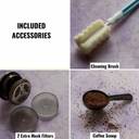 • Protective Sleeve, Cleaning Brush, 2 Extra Mesh Filters, Coffee Scoup