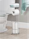 Holds up to 2 reserve rolls and dispenses 1 roll. Includes top shelf for wet wipes, cell phones and more for extra storage. Perfect for those who don't have a permanent roll fixture on their wall. Design great for small spaces. Made of steel with chrome finish.