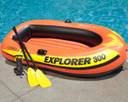 The Explorer 300 Boat Set can easily carry two adults and one child for an adventurous day out on the water. Three different air chambers keep the boat solid with the capability of carrying 186 kg. The floor has an inflatable I-beam to support you and your passengers. Included are two oars for quick travel, adding versatility to the places you can go. Welded on either side are two oar locks that keep the oars in place as you row. The all -around grab line lets you tow the boat when needed. To inflate the boat use the Intex Double Quick I Hand Pump that inflates on the fore and backstroke to maximize efficiency. At the end of a great day, quickly deflate with the Boston valve on the main hull chamber.
