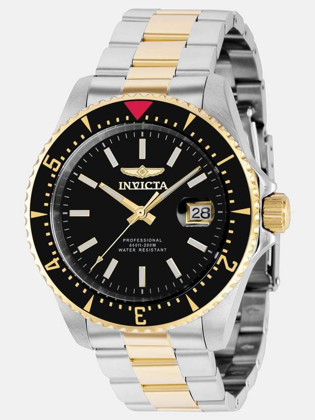 The Invicta 36787 Pro Diver watch has a 44 mm steel and gold stainless steel case, a black dial protected by resistant mineral crystal and a gold steel stainless steel band.This model is powered by an accurate Automatic movement. Resistant to water up to 200 meters.Including 2-year Invicta warranty.