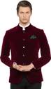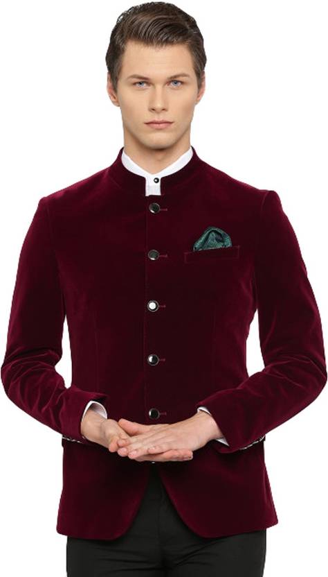 Maroon velvet formal blazer, has a stylised mandarin collar, a full button placket, long sleeves with buttoned detail, three pockets on the front, a double vented back hem, an attached lining with two welt pockets. Upgrade your wardrobe with this classy blazer from INVICTUS. Create a suave look by layering it over a crisp shirt and teaming with formal trousers.