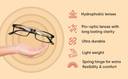 Durable and Strong: Acrylic provides good resistance to breakage and is a cost-effective option., Resistant to UV Light: Acrylic material naturally provides UV protection, which is a useful property for eyewear., Highly Durable: PC is known for its impact resistance and is significantly tougher than regular plastic. This makes it ideal for temple tips that need to withstand frequent handling.