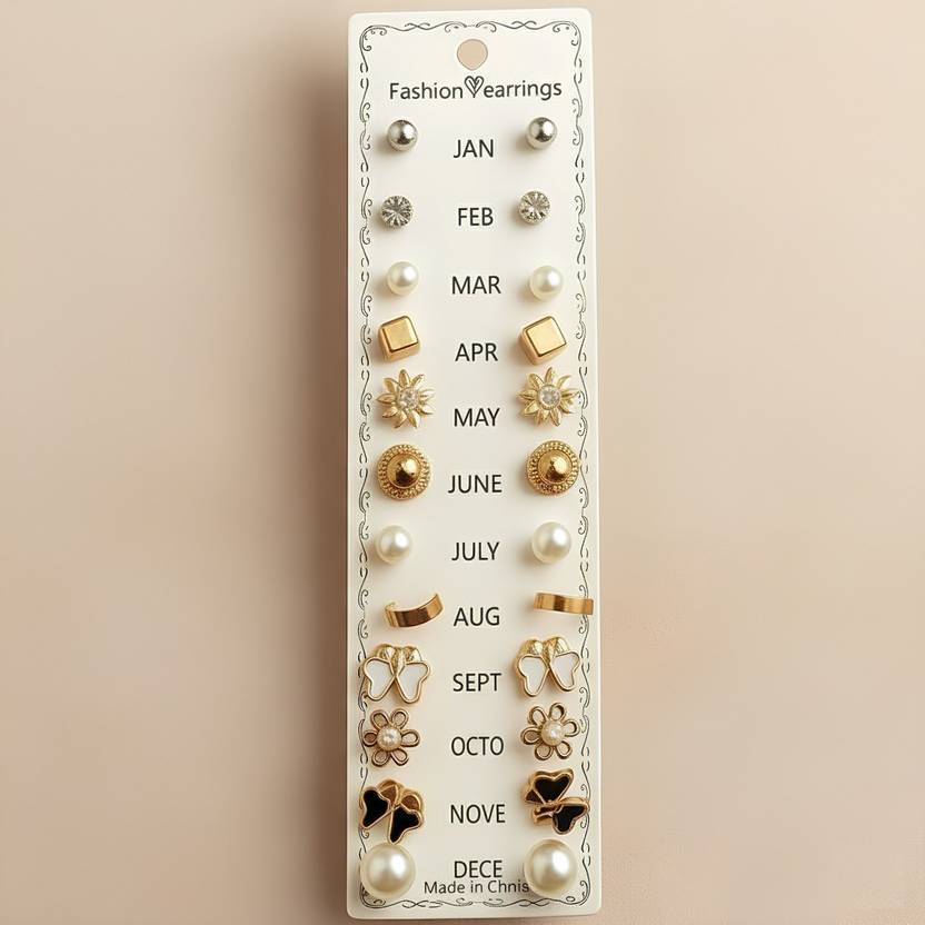 12 pairs of stylish earrings (Jan–Dec collection), Mix of pearls, crystals, floral and trendy studs, Mix of pearls, crystals, floral and trendy studs, Lightweight, skin-friendly & comfortable for daily wear, Matches both western and traditional outfits, Ideal for office, college, parties, casual outings, festivals & daily wear, Great gift choice for birthdays, anniversaries & festivals