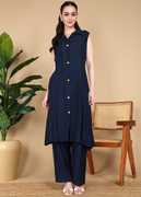 Sleeveless tunic with a button-down front for a sleek and trendy appeal, Classic shirt collar for a structured yet relaxed fit, Comfortable straight-leg pants for all-day ease, Made from breathable, lightweight fabric for maximum comfort, Versatile outfit for casual, work, or semi-formal occasions, Pair it with statement earrings and strappy sandals for a polished look.